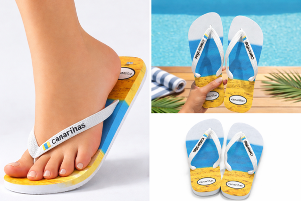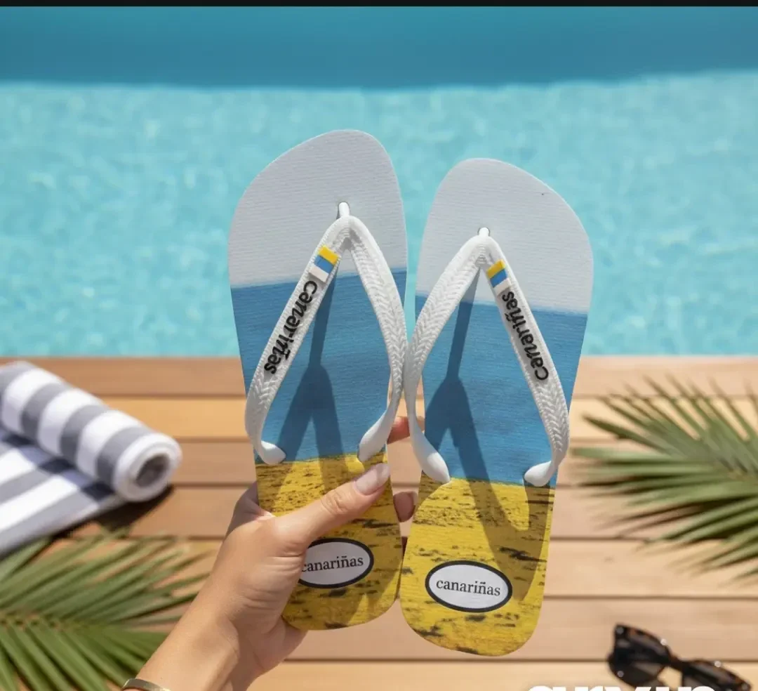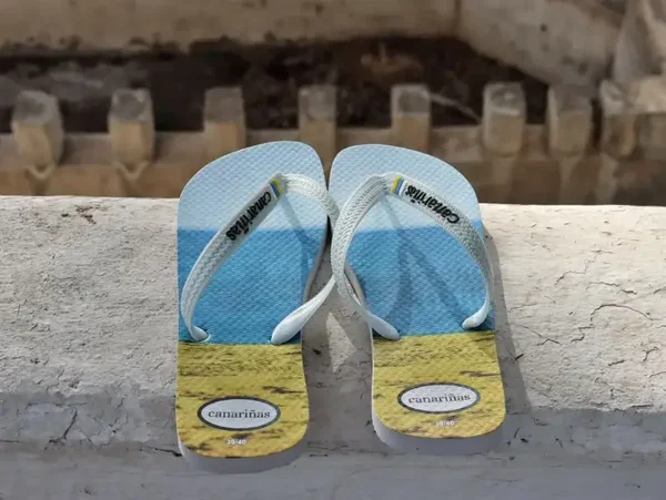 Lleva la esencia del archipiélago en tus pies con las nuevas Chanclas Canariñas. Estas sandalias de dedo presentan un diseño veraniego único, con una plantilla dividida en tres tonos que evocan el paisaje isleño: el azul profundo del mar, el amarillo cálido de la arena y el blanco puro del cielo.