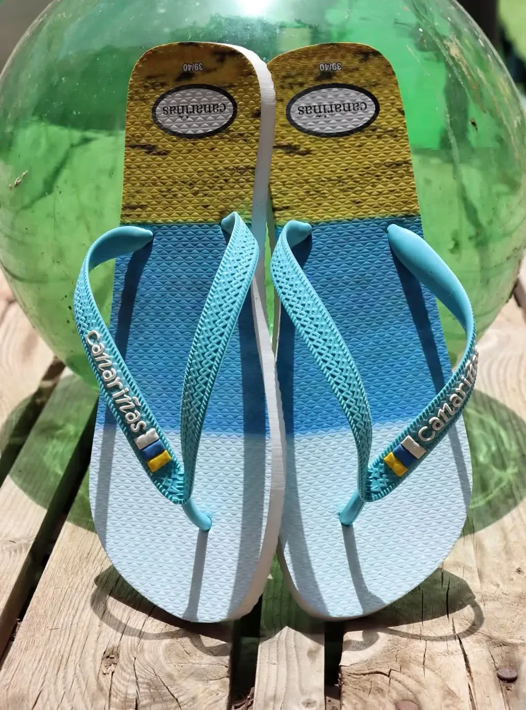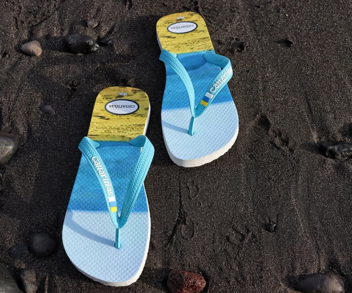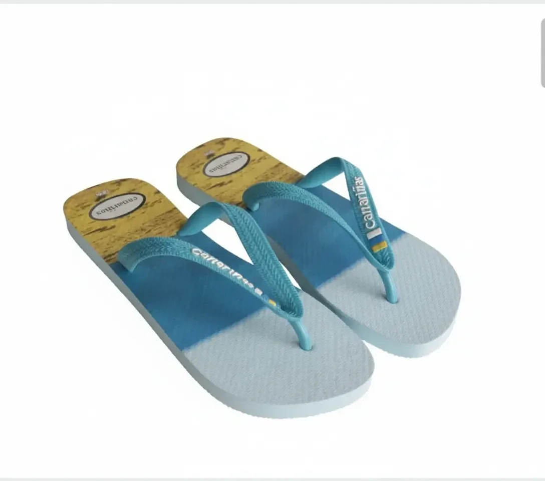 Chanclas canariñas, son sandalias de dedo con diseño veraniego inspirado en la playa. La plantilla presenta una imagen dividida en tres tonos que cuentan una historia: azul como el mar, amarillo como la arena y el blanco como el cielo.