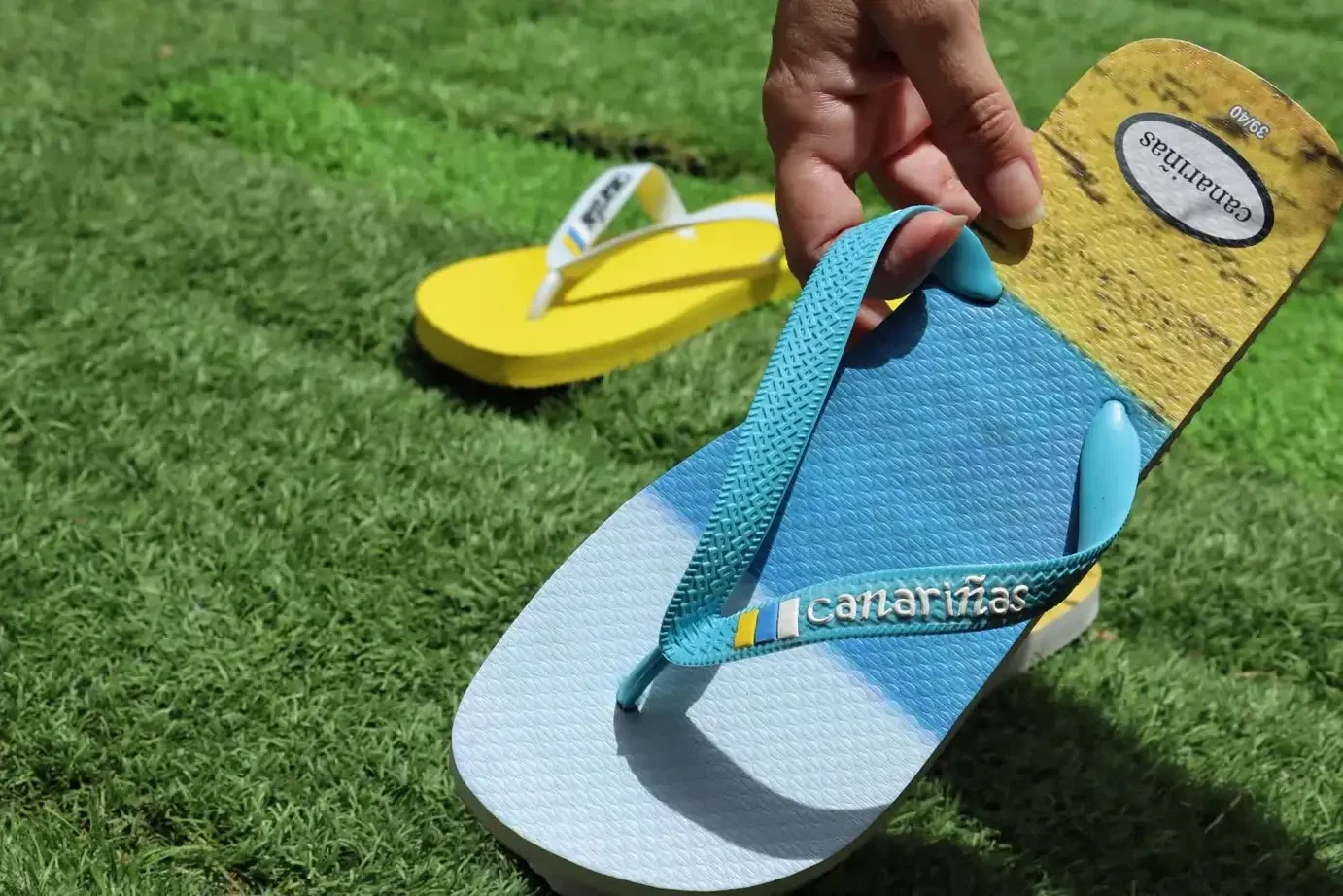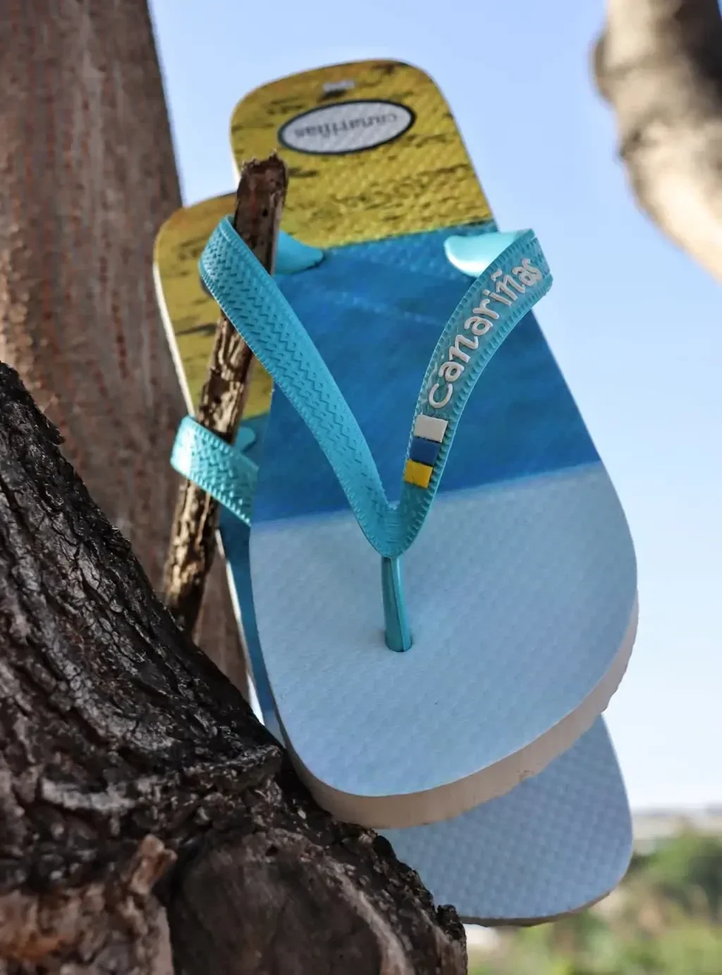 Las tiras en color azul incluyen el nombre de la marca Canariñas y un pequeño detalle de color que aporta un toque distintivo. Están fabricadas en material ligero, flexible y resistente, ideal para el uso diario en verano.