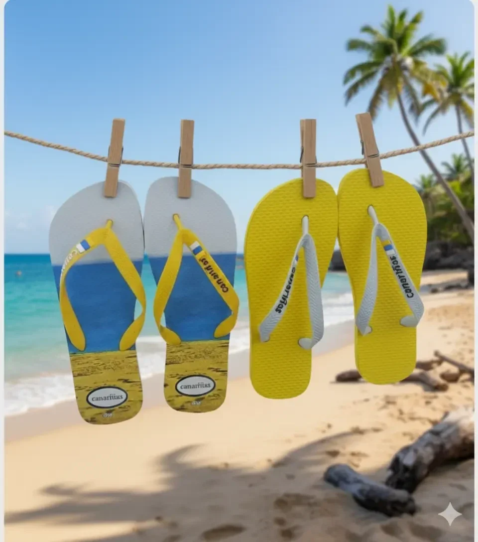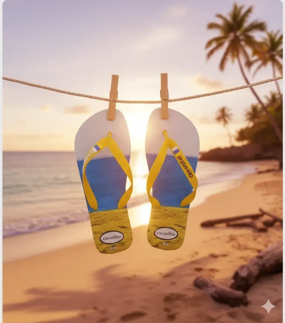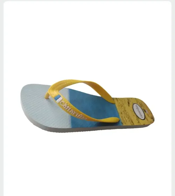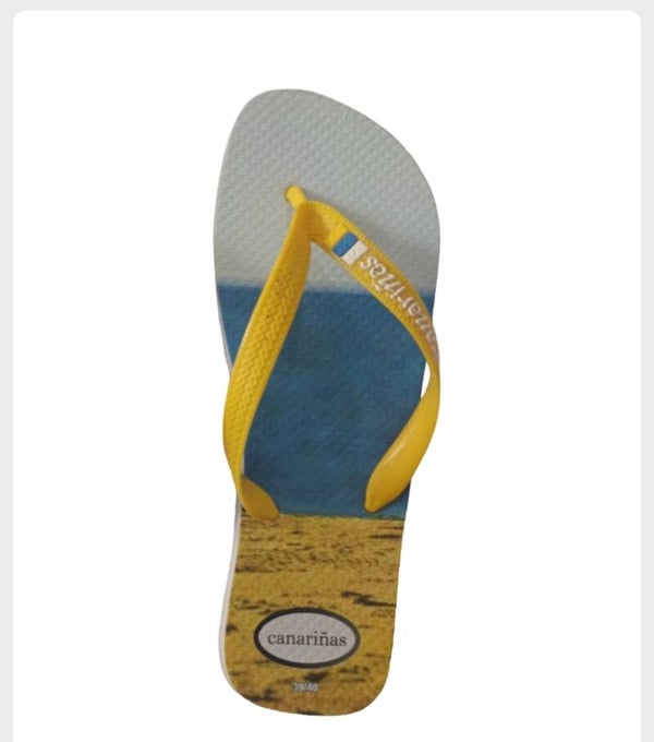Chanclas canariñas, son sandalias de dedo con diseño veraniego inspirado en la playa. La plantilla presenta una imagen dividida en tres tonos que cuentan una historia: azul como el mar, amarillo como la arena y el blanco como el cielo.