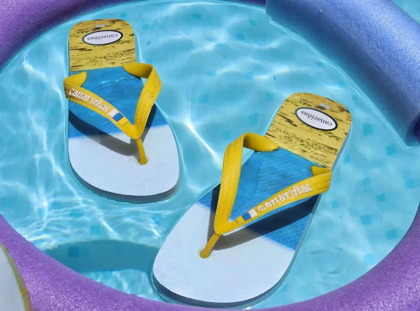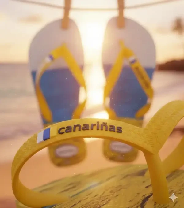 Las tiras en color amarillo incluyen el nombre de la marca Canariñas y un pequeño detalle de color que aporta un toque distintivo. Están fabricadas en material ligero, flexible y resistente, ideal para el uso diario en verano.